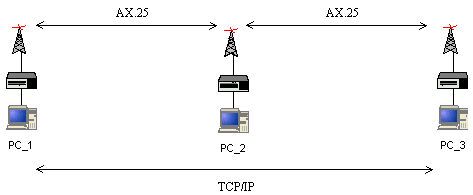 Supongamos que el usuario del PC_1 quiere mandar un email al usuario del PC_2. En el nivel de aplicación intervendrán los protocolos de correo electrónico SMTP y POP3. A nivel de transporte y para dar fiabilidad a la comunicación, se utilizará TCP. En el nivel de red intervendrá IP, implementado por los propios PCs, por lo que cada uno de ellos deberá tener su propia dirección IP. En el nivel de enlace se utiliza AX.25, implementado por las TNCs, para asegurar las comunicaciones PC_1—PC_2 y PC_2—PC3. Finalmente, el medio físico son las ondas de radio.