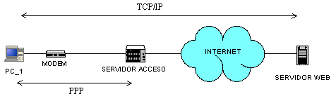 La forma más común de acceso a Internet es mediante la utilización de un módem telefónico, proceso conocido como "Acceso telefónico a redes". A continuación se describe toda la secuencia de conexión a Internet y de transmisión de datos, en base al escenario descrito en la figura 3 y tomando como ejemplo la descarga de una página web del servidor al PC_1: